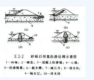 當(dāng)?shù)[石透水層不厚時,可挖出梯形槽回填黏土成為截水槽。當(dāng)透水層較厚時,可用板樁、連續(xù)的混凝土排樁和混凝土防滲墻等垂直防滲措施截?cái)嗤杆畬樱鐖D8.2-2(b)所示。對于防滲要求較高的砂礫壩基,可用相互搭接的大直徑鉆孔樁穿過透水層,形成一道連續(xù)橫向防滲墻。