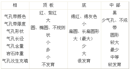 、 氣孔狀熔巖頂、底、中部氣孔特征不一,列表如下: