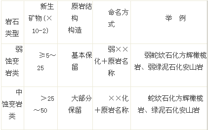 復(fù)原巖時(shí),命名按:主要蝕變礦物或蝕變礦物組合+蝕變巖基本名稱(chēng)。例如:綠簾青盤(pán)巖,剛玉紅柱次生石英巖。