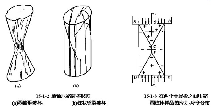 2)柱狀劈裂破壞(見圖15-1-2b):在發現圓錐形破壞的真正原因之后有人在上下壓板與試件端面之間,涂上了一層薄薄的凡士林以減小接觸面之間的摩擦力,最終巖石試件由于產生平行于所施加的軸向力的裂縫而破壞。對于不同的巖石所含的礦物成份和所含裂隙的不同,局部還會出現些較小的斜向裂縫。應該說柱狀劈裂破壞是真正反映巖石單軸壓縮破壞的形態。