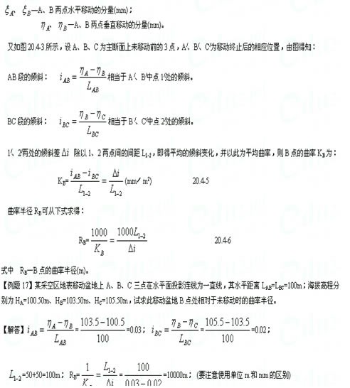 為便于對于地表進行分析研究,將地表變形分為2種移動和3種變形。2種移動是:垂直移動(下沉)和水平移動;3種變形是:傾斜、彎曲(曲率)和水平變形(伸張或壓縮)。下面取一主斷面分析各類變形的情況,見圖20.4-2,圖20.4-3。