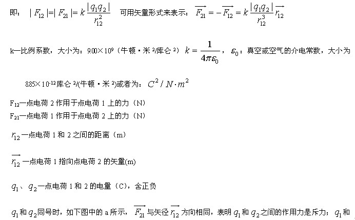 庫(kù)侖定律: 在真空中兩個(gè)靜止點(diǎn)電荷間的相互作用力,方向沿兩個(gè)點(diǎn)電荷的連線(xiàn),同種電荷相斥,異種電荷相吸;大小正比于兩點(diǎn)電荷電量大小的乘積,反比于兩點(diǎn)電荷間距離的平方。