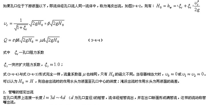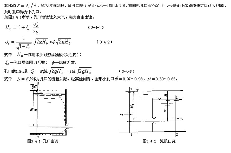 流體經孔口流出稱為孔口出流。如圖3-4-1。當容器中水位(或壓強)不變,孔口的出流量恒定時,稱為恒定出流。當容器壁比較薄,或孔口具有銳緣時,孔口的壁厚對出流沒有干擾作用,稱為薄壁孔口。流體從容器的四面八方流向孔口,流線成光滑曲線向孔口集中,在孔口斷面上流線不相平行,繼續收縮至距孔口斷面d/2(d為孔口直徑)處流線才趨于平行,此斷面稱為收縮斷面,即圖3-4-1中斷面c-c。收縮斷面的面積A,小于孔口面積A,