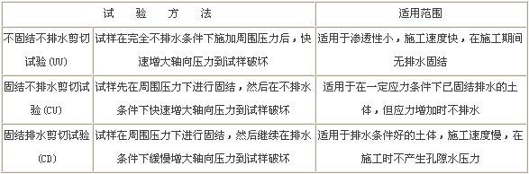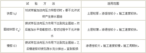 土的抗剪強度按試驗儀器不同分為直剪試驗和三軸剪切試驗,直接試驗、三軸剪切試驗的方法和適用范圍見表1、表2。GBJ7-89規范規定,對一級建筑物,抗剪強度試驗應采用不固結不排水三軸壓力試驗。GB50021-94規范規定,基坑支護工程,應提供有效應力強度參數固結不排水抗剪強度。對滑帶土宜進行反復直剪試驗,并提供殘余抗剪強度。