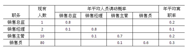 某企業進行人力資源需求與供給預測。經過調查研究與分析,確認本企業的銷售額(萬元)和所需銷售人員數(人)成正相關關系,并根據過去10年的統計資料建立了一元線性回歸預測模型y=20+0.04X,X代表年銷售額,Y代表銷售人員數。該企業人員變動矩陣如下表所示。預計2013年銷售額將達到2000萬元。該企業根據人力資源需求與供給狀況及相關資料,制定2013年員工招聘計劃和員工培訓計劃。