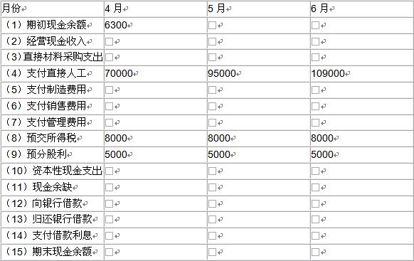 (3)該企業4~6月份的制造費用分別為40000元、45000元和70000元,其中包括非付現費用每月10000元。4~6月份的銷售費用分別為25000元、30000元和35000元,每月的非付現銷售費用均為5000元。4~6月份的管理費用均為50000元,其中非付現費用每月為20000元。