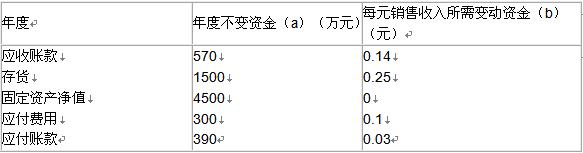 該企業2007年的相關預測數據為:銷售收入20000萬元,新增留存收益100萬元;不變現金總額1000萬元,每元銷售收入占用變動現金0.05元,其他與銷售收入變化有關的資產負債表項目預測數據如表所示。