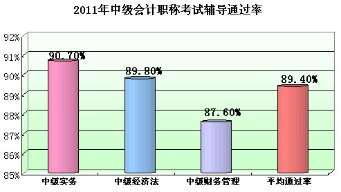 中級會計實務90.7%、中級經濟法89.8%、中級財務管理87.6%、平均通過率89.4%