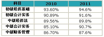 環球網校(www.edu24ol.com)通過對網校學員的回訪及學員的成績反饋,總結出網校2011年會計職稱考試輔導通過率情況如下: