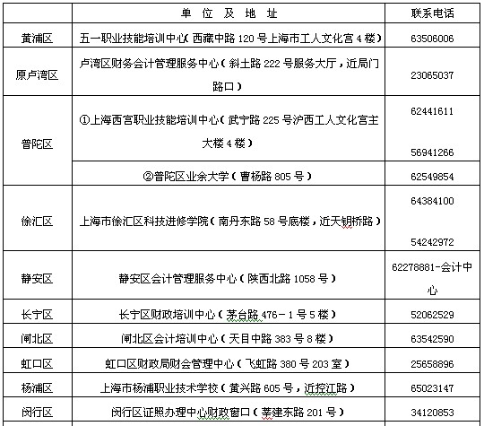 上海2012年會計職稱考試各區縣咨詢服務地址及電話