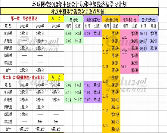 2012年中級會計職稱考試《中級經濟法》學習計劃表