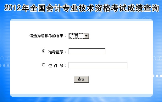 摘要 2012年度全國會計專業(yè)技術資格考試成績已公布,即日起廣西考生可登陸本網站查詢考試成績