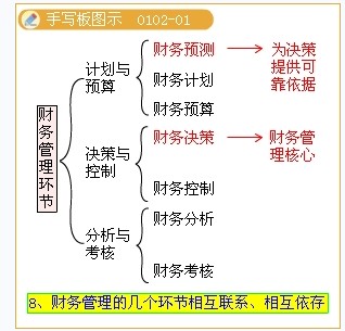 計劃與預算【財務預測、財務計劃、財務預算(有定性預測和定量預測,第2章)】;決策與控制【財務決策、財務控制(第6章)】;分析與考核【財務分析、財務考核(第8章)】