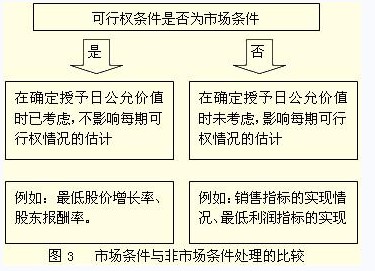 2.業績條件,是指職工或其他方完成規定服務期限且企業已經達到特定業績目標才可行權的條件,具體包括市場條件和非市場條件。(1)市場條件。市場條件是指行權價格、可行權條件以及行權可能性與權益工具的市場價格相關的業績條件,如股份支付協議中關于股價上升至何種水平職工可相應取得多少股份的規定。(2)非市場條件。非市場條件是指除市場條件之外的其他業績條件,如股份支付協議中關于達到最低盈利目標或銷售目標才可行權的規定。