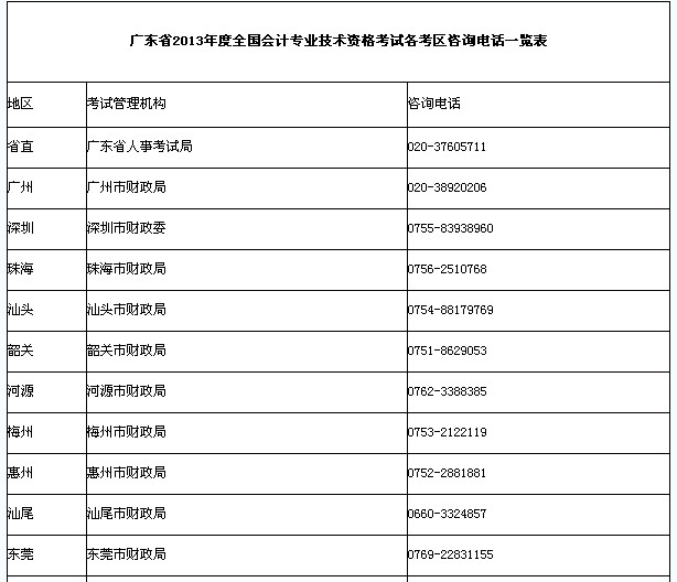 2013年廣東省初級會計職稱考試各考區咨詢電話一覽表