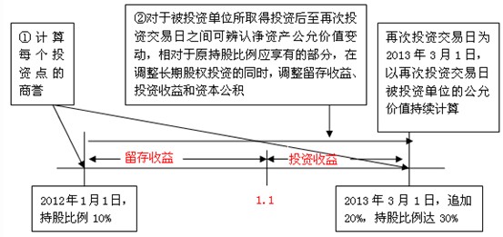 關鍵點:為使全部投資按再次投資交易日被投資單位可辨認凈資產公允價值持續計算,則應將原投資持股比例部分調整到再次投資交易日享有被投資單位可辨認凈資產公允價值的份額。