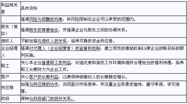 股東作為企業(yè)所有者,在企業(yè)中承擔著最大的權(quán)力、義務、風險和報酬,但是債權(quán)人、員工、企業(yè)經(jīng)營者、客戶、供應商和政府也為企業(yè)承擔著風險。 這些相關(guān)利益群體的利益都應該予以考慮。