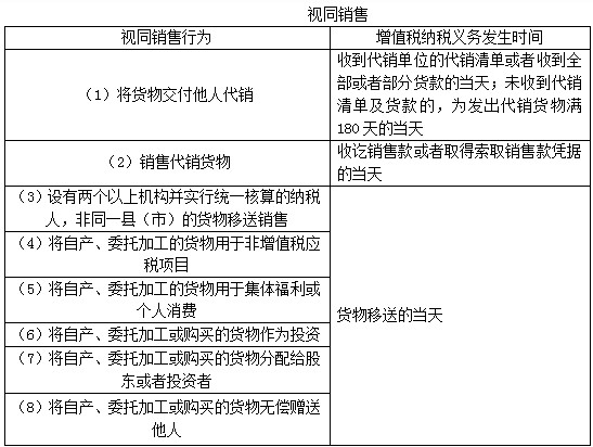 【解釋1】將貨物交付他人代銷時,委托方視同銷售,增值稅的納稅義務發生時間為委托方收到代銷清單的當天或者收到全部或者部分貨款的當天;未收到代銷清單及貨款的,為發出代銷貨物滿180天的當天。受托方(銷售代銷貨物)售出代銷貨物時發生增值稅納稅義務,按照全部銷售額計算銷項稅額;對收取的代銷手續費,應繳納營業稅。