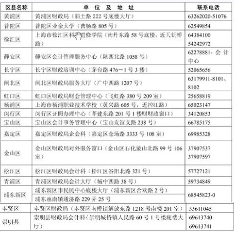 (一)領取初級資格證書確認所屬區縣財政局,請查詢成績單上的發證編號,如1310-0451-2-00427,代碼為:0451徐匯區、0551長寧區、0651靜安區、0751普陀區、0851閘北區、0951虹口區、1051楊浦區、1251閔行區、1351寶山區、1451浦東新區(不含惠南)、1951黃浦區、2251嘉定區、2551浦東新區(惠南)、2651奉賢區、2751松江區、2851金山區、2951青浦區、3051崇明縣。