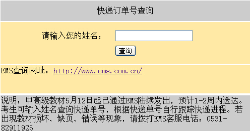 說明:中高級教材5月12日起已通過EMS陸續(xù)發(fā)出,預(yù)計1-2周內(nèi)送達。考生可輸入姓名查詢快遞單號,根據(jù)快遞單號自行跟蹤快遞進程。若出現(xiàn)教材損壞、缺頁、錯誤等現(xiàn)象,請撥打EMS客服電話:0531-82911926
