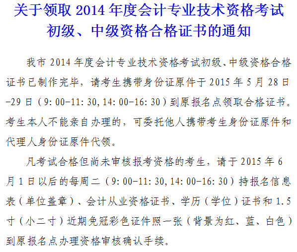 天津2014年中級(jí)會(huì)計(jì)職稱合格證書領(lǐng)取時(shí)間5月28日-29日