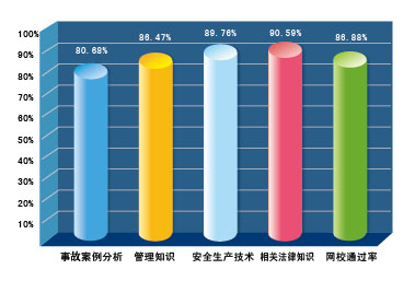 環(huán)球網(wǎng)校(www.edu24ol.com)通過對網(wǎng)校學(xué)員的回訪,總結(jié)出網(wǎng)校2007年安全工程師考試輔導(dǎo)通過率情況為:《安全生產(chǎn)法及相關(guān)法律知識》80.68%、《安全生產(chǎn)管理知識》86.47%、《安全生產(chǎn)技術(shù)》89.76%、《安全生產(chǎn)事故案例分析》90.59%。各科平均通過率為86.88%。