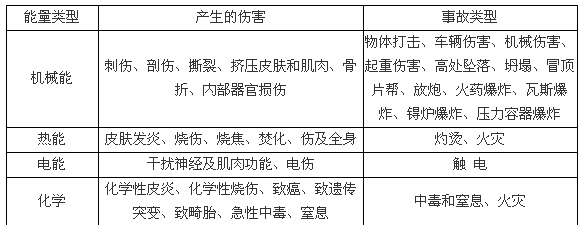 能量在人類的生產、生活中是不可缺少的,人類利用各種形式的能量做功以實現預定的目的。人類在利用能量的時候必須采取措施控制能量,使能量按照人們的意圖產生、轉換和做功。從能量在系統中流動的角度,應該控制能量按照人們規定的能量流通渠道流動。如果由于某種原因失去了對能量控制,就會發生能量違背人的意愿的意外釋放或逸出,使進行中的活動中而發生事故。如果事故時意外釋放的能量作用于人體,并且能量的作用超人體的承受能力,則將造成人員傷害;如果意外釋放的能量作用于設備、建筑物、物體等,并且能量的作用超過它們的抵抗能力,則將造成設備、建筑物、物體的損壞。