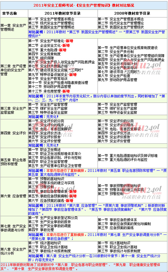 2011年安全工程師考試《安全生產(chǎn)管理知識(shí)》教材對(duì)比