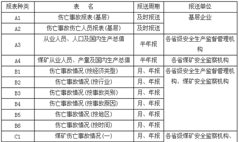 報送時間:省級安全生產監督管理機構,在每月10日前報送上月的事故統計報表(B1一B6表)。省級煤礦安全監察機構和未設煤礦安全監察機構的省(區、市)的安全生產監督管理機構,在每月10日前報送上月的事故統計報表。各部門在每月15日前報送上月的事故統計報表(D1一D7表)。省級以下各級機構、各企業報送統計報表種類及報送時間由省級機構規定。