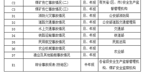 (4) 消防火災事故情況表D1,由公安部消防局報送;道路交通事故情況表D2,由公安部道路交通管理局報送;水上交通事故情況表D3,由交通部海事局報送;鐵路運輸事故情況表D4,由鐵道部安監司報送;民航飛行事故情況表D5,由民航總局安全辦公室報送;農業機械事故情況表D6,由農業部農機監理總站報送;漁業及其他船舶事故表D7,由農業部漁政指揮中心報送。