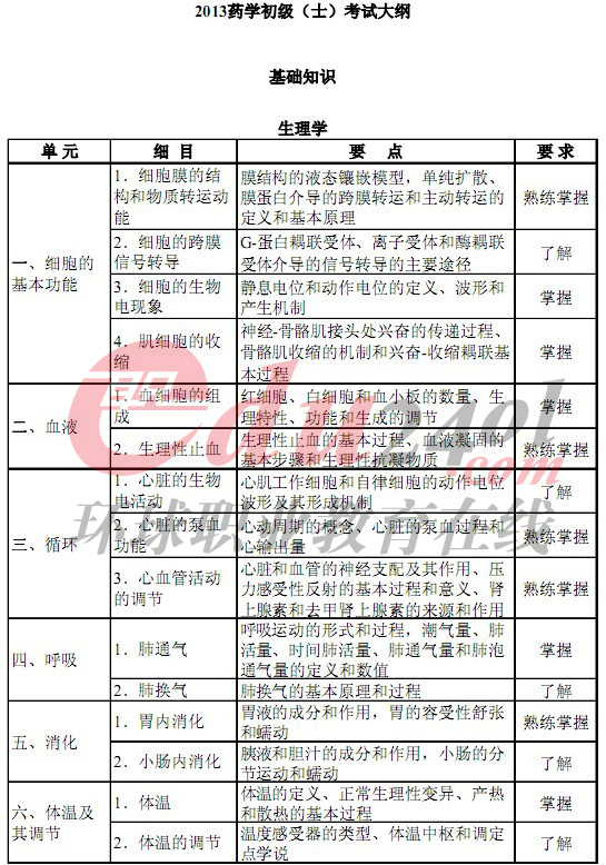 2013藥學(xué)職稱初級藥士(代碼101) 考試大綱-基礎(chǔ)知識