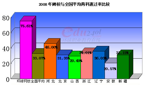 全國兩科通過情況:2008年全國報考兩科的平均通過率為33.07%,部分地區的通過率為河北省46%(最高)、北京31.35%、山西29.49%、浙江34.01%、遼寧36.03%、安徽28.57%、新疆31.15%。環球網校兩科通過率為75.61%,是全國水平和地方(河北省除外)水平的兩倍。