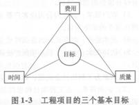 費用、時間和質量三大目標之間是對立統(tǒng)一的,如圖1―3所示。一方面,如果工程項目的功能和質量要求較高,則需要較好的工程設備和材料,還需要精工細作,需要較長的建設周期,投入較多的資金;如果要加快進度、縮短工期,則需要增加作業(yè)班次,增加人力和設備,導致施工效率下降,增加單位產(chǎn)品費用,最終增加工程總投資;如果要降低投資,則需考慮降低功能和質量要求,需要按費用最低的原則安排進度計劃,則整個工程的建設周期將較長,三大目標之間存在對立關系。另一方面,加快進度、縮短工期盡管需要增加一定的投資,但由于整個工程提前投產(chǎn)使用,可提早回收投資,提早產(chǎn)生收益。從理論上講,當提前投產(chǎn)得到的收益高于因工期縮短而增加的投資時,則加快進度就是正確的決策。又如,提高功能和質量要求,雖然增加一次性投入,但降低了生產(chǎn)運營和維護費用,從工程項目全壽命周期費用分析可能還是節(jié)約了投資,三大目標之間又存在統(tǒng)一關系。因此,三大目標之間需要作為一個系統(tǒng)統(tǒng)籌考慮,反復協(xié)調和平衡,力求以資源的最優(yōu)配置實現(xiàn)工程項目目標。