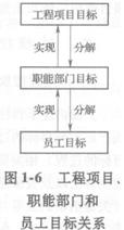 目標系統中的各級目標對應工程項目組織機構中相應級別的職能部門。高層管理人員制定了工程項目的總目標,工程項目組織中的各級職能部門根據總目標的要求制定相應的目標和實現目標的工作計劃,而職能部門的人員則根據本部門目標確定各自的工作職責范圍和工作成果。工程項目目標、職能部門目標和員工目標的關系如圖1―6所示。