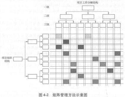 工作分解結(jié)構(gòu)將項(xiàng)目依次分解成較小的項(xiàng)目單元,直到滿足項(xiàng)目控制需要的最低層次,這就形成了一種層次化的“樹”狀結(jié)構(gòu)。這一樹狀結(jié)構(gòu)將項(xiàng)目合同中規(guī)定的全部工作分解為便于管理的獨(dú)立單元,并將完成這些單元工作的責(zé)任賦予相應(yīng)的具體部門和人員,從而在項(xiàng)目資源與項(xiàng)目工作之間建立了一種明確的目標(biāo)責(zé)任關(guān)系,這就形成了一種職能責(zé)任矩陣。如圖4-2所示。