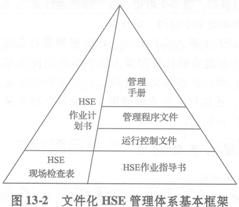 管理體系中還包括了HSE管理手冊(cè)、程序文件、作業(yè)文件以及HSE作業(yè)計(jì)劃書(shū)、HSE作業(yè)指導(dǎo)書(shū)以及HSE現(xiàn)場(chǎng)檢查表等。這些文件的編制是實(shí)施HSE管理的重要組成部分,如圖13-2所示。