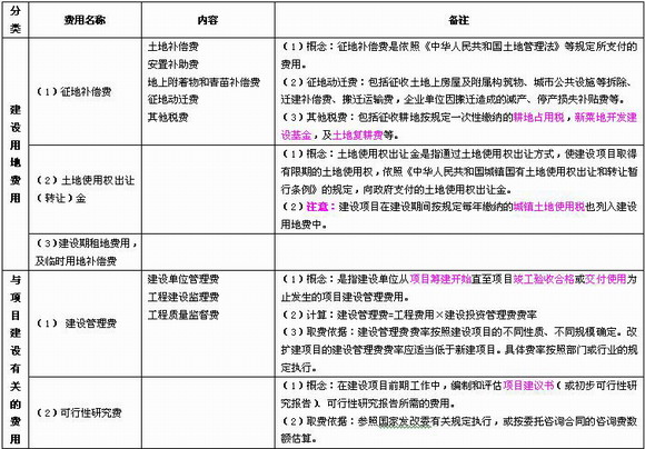 按其內容大體可分為三類:第一類是建設用地費用;第二類是與項目建設有關的費用;第三類是與項目運營有關的費用。具體參見表6-8。