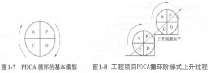 PDCA循環(huán)實(shí)際上是有效進(jìn)行任何一項(xiàng)工作的合乎邏輯的工作程序。PDCA四個(gè)過程不是運(yùn)行一次就完結(jié),而是要周而復(fù)始地進(jìn)行,其基本模型如圖1-7所示。工程項(xiàng)目的PDCA循環(huán)呈現(xiàn)階梯式上升的趨勢(shì)。PDCA循環(huán)不是在同一水平上循環(huán),每循環(huán)一次,就解決一部分問題,取得一部分成果,工作就前進(jìn)一步。到了下一次循環(huán),又有了新的目標(biāo)和內(nèi)容。圖1―8表示了工程項(xiàng)目PDCA循環(huán)階梯式上升的過程。
