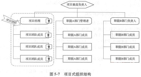 項目式組織結構形式就是將項目的組織獨立于公司職能部門之外,由項目組織自己獨立負責項目的主要工作的一種組織管理模式。項目的具體工作主要由項目團隊負責。項目的行政事務、財務、人事等在公司規定的權限內進行管理。如圖5-7所示。