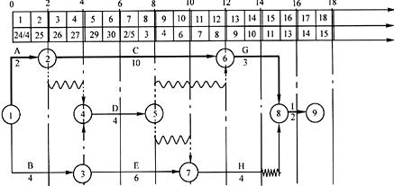 時標(biāo)網(wǎng)絡(luò)計劃以實箭線表示工作,每項工作直線段的水平投影長度代表工作的持續(xù)時間,以虛箭線表示虛工作,以波形線表示工作與其緊后工作之間的時間間隔(以網(wǎng)絡(luò)計劃終點節(jié)點為完成節(jié)點的工作除外)。當(dāng)工作之后緊接有實工作時,波形線表示本工作的自由時差;當(dāng)工作之后只緊接虛工作時,則緊接的虛工作的波形線中的最短者為該工作的自由時差。