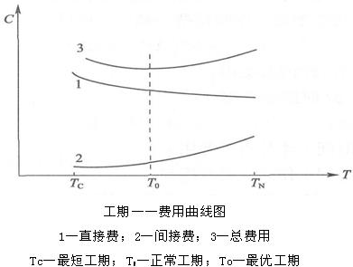 在進(jìn)行費(fèi)用優(yōu)化時(shí),把工程費(fèi)用分為兩部分,一為直接費(fèi),如人工費(fèi)、材料費(fèi)、施工機(jī)械使用費(fèi)等。若要縮短工期,可能需夜班工作或在擁擠的工作面上工作,引起工效降低和直接費(fèi)的增加。二為間接費(fèi),例如企業(yè)管理費(fèi)。如果縮短工期間接費(fèi)將減少,由于兩者對(duì)于工期長短來說,具有相反的性質(zhì),所以,總費(fèi)用如下圖所示。在總費(fèi)用曲中,必定有一個(gè)總費(fèi)用最少的工期,這就是費(fèi)用優(yōu)化所尋求的目標(biāo),對(duì)應(yīng)的工期稱為最優(yōu)工期。
