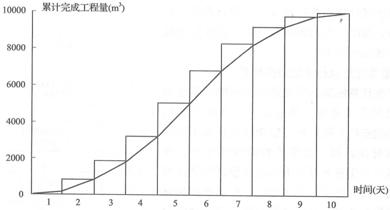 這種方法是以時間為橫軸,以完成累計工作量(該工作量的具體表示內容可以是實物工程量的大小、工時消耗或費用支出額,也可以用相應的百分比來表示)為縱軸,按計劃時間累計完成任務量的曲線作為預定的進度計劃。從整個項目的實施進度來看,由于項目的初期和后期速度比較慢,因而進度曲線大體呈S形。如圖所示 。