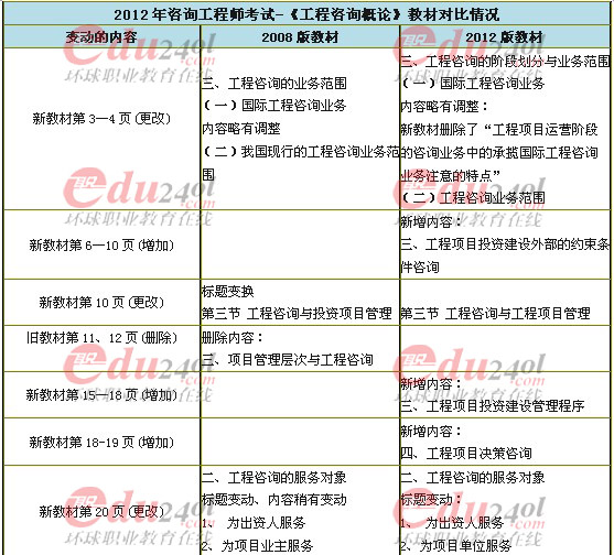 環球網校(www.edu24ol.com)消息,2012年咨詢工程師考試教材已經公布,為了讓廣大更加醒目的了解到新教材變化,網校現將2012年教材的變化情況進行了整理和對比。2012年咨詢工程師考試《工程咨詢概論》(2012版與08版)教材對比情況如下: