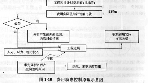 工程項目一次性、固定性、諸多因素帶有不確定性等特點決定了其過程控制的動態特征,必須在項目實施過程中根據情況的變化進行項目目標的動態控制。動態控制廣泛應用于工程項目的進度控制、費用控制、質量控制等過程中。以費用控制為例,其基本原理如圖1-10所示。工程項目動態控制的糾偏措施主要有:組織措施、管理措施、經濟措施、技術措施等。