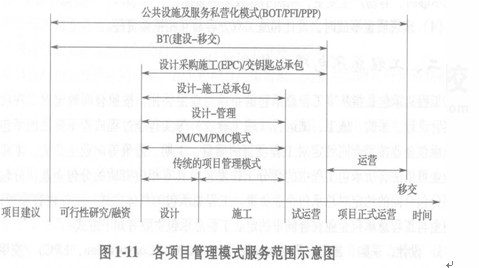 根據工程項目的合同關系與組織管理關系的不同,考慮工程項目融資、設計、采購、施工、運營的一體化程度,工程項目的管理模式的服務范圍如圖1―11所示。