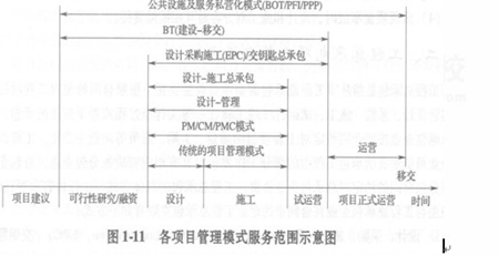 根據工程項目的合同關系與組織管理關系的不同,考慮工程項目融資、設計、采購、施工、運營的一體化程度,工程項目的管理模式的服務范圍如圖1―11所示。$lesson$