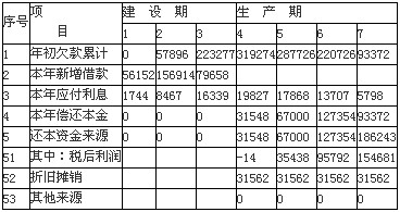 償還本金的資金來源包括可用于還款的稅后利潤、折舊攤銷及其他項目中,第7年初欠款累計為93372,但第7年可用于還款的資金來源達到186243,因此借款償還期為:6+93772/186243=6.5(年)