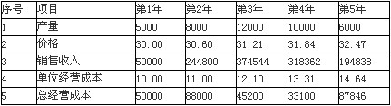本項目預計在未來5年時間內的產量分別為5000單位、8000單位、12000單位、10000單位和6000單位。產品第一年的單價為30元,由于該產品具有高度的市場競爭性,預測在相對于5%的通貨膨脹率的情況下,產品價格每年將增長2%。由于通貨膨脹的影響和原材料價格的大量上漲,預計單位經營成本將在第一年10元的基礎上,每年增長10%。本項目不考慮利息費用。該公司銷售收入和經營成本估算如下: