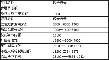 本例中,更新改造的投資可以使操作人員年工資減少18000萬元,年運營維護費從8500萬元降至6800萬元,年殘次品損失可以從7200萬元降至1800萬元。