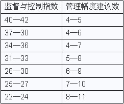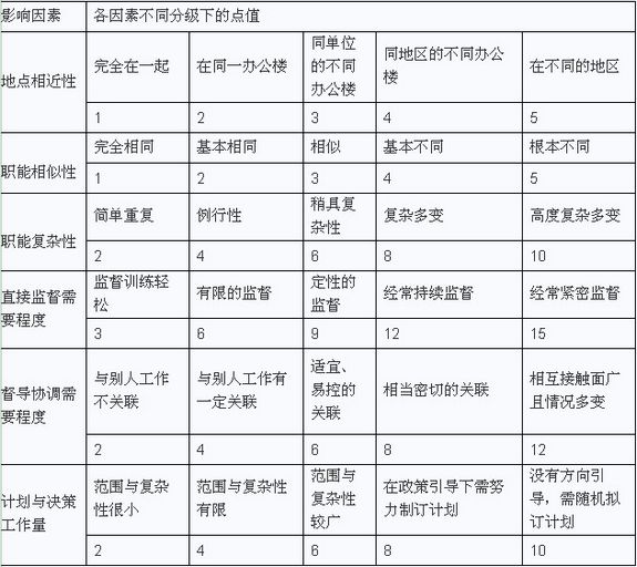 主要是確定影響管理幅度的因素,并將各因素進(jìn)行分級(jí)并賦予一定的指數(shù),如表5―1所示;針對(duì)某一職位的具體情況,計(jì)算其分值,然后根據(jù)助手配備情況對(duì)分值修正后,對(duì)照管理幅度建議表得出管理幅度,如表5―2所示。